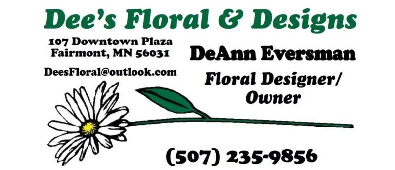 Dee's Floral & Designs delivers flowers and gifts to the Fairmont, MN area. You can send flowers for any occasion including Mother's Day and Valentine's Day. We offer a large variety of fresh flowers and gifts. Enjoy the convenience of safe and secure ordering online 24 hours a day. The goal is to exceed our customers' expectations with quality, value and professional service.